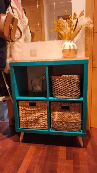 Mueble auxiliar con un diseño moderno y funcional, que he usado durante 3 años como recibidor. La base es el mueble Kallax de Ikea en azul turquesa (desde hace años no lo fabrican en ese color). Yo compré patas de madera y una tabla de madera maciza que le puse como base. - Estructura principal en color azul turquesa. - Encimera de madera. - Las cestas no están incluidas.