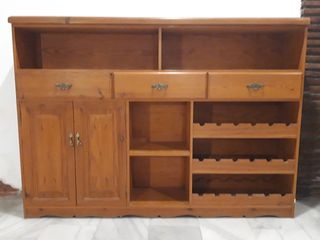Mueble de madera maciza con cobertura de loza. Dos armarios, zona de botellero y tres cajones amplios