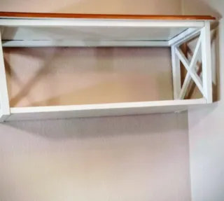 Repisa de madera maciza con un diseño elegante. - Acabado en blanco y madera natural. - Estructura con detalles cruzados.