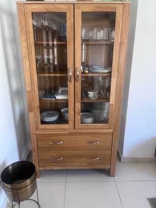 Bonita vitrina de madera maciza con puertas de cristal. Ideal para almacenar y exhibir vajilla y cristalería. Roble macizo, chapa de roble y cristal templado. 2 puertas, 2 cajones y 3 estantes. A100 x A190 x P45 cm - Dos puertas de cristal. - Dos cajones. - Estructura robusta y elegante. - Perfecto estado.