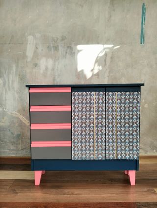Cómoda azul y rosa con cajones y puertas