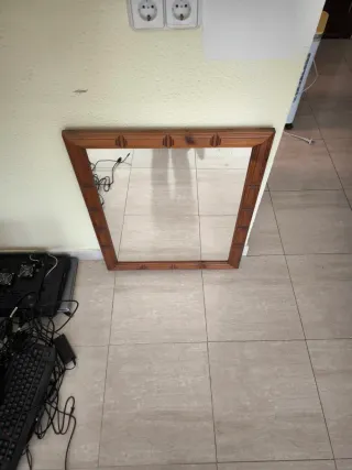 Mueble recibidor de madera maciza con espejo – estilo colonial / étnico Elegante mueble de recibidor en madera maciza natural, con espejo a juego. Diseño robusto y atemporal, con amplio espacio de almacenaje y estantería inferior. En perfecto estado, ideal para dar personalidad y calidez a la entrada de la vivienda. El mueble se encuentra en muy buen estado general. Presenta ligeras marcas superficiales de uso en la parte superior, visibles en las fotos (una marca circular y una pequeña señal), propias del uso normal. No afectan a la funcionalidad ni a la estructura del mueble.