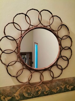 Elegante espejo redondo con un marco decorativo y aparador de mimbre. Su diseño orgánico añade un toque natural a cualquier espacio.