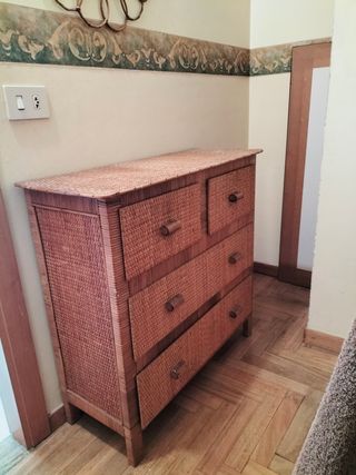 Vendo este aparador de salón o mueble auxiliar estilo cannage de HOMCOM. El producto es nuevo. Tiene una puerta de ratán natural y cuatro cajones muy prácticos para guardar de todo. Es de melamina color madera con patas de pino, ideal para la entrada o el comedor. Producto de devolución y reacondicionamiento. Puede tener algún desperfecto o tara. REF: Cómpralo ya y te lo envío en 24 horas. Entrega hoy en provincia de Barcelona: 10 €. REF: C2-838-370V00ND-1215-J