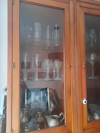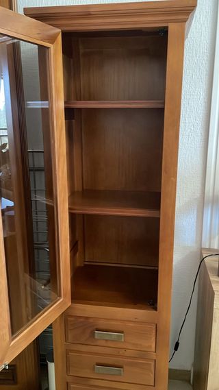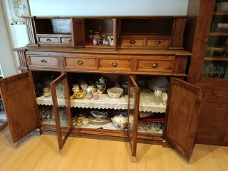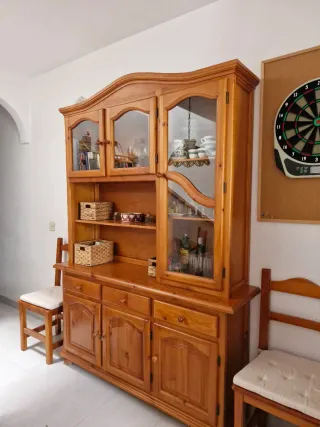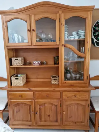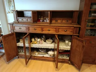 Vendo vitrina–aparador de madera maciza, robusta y de estilo clásico, ideal para salón o comedor. Mueble muy amplio y funcional, con gran capacidad de almacenaje: vitrinas con cristal para vajilla o decoración, varios armarios cerrados, cajones centrales y estanterías abiertas. Está en buen estado general, bien cuidada, con herrajes originales y un acabado en madera natural muy elegante. Perfecta para guardar copas, platos, libros o cualquier objeto decorativo, aportando un toque clásico y acogedor al hogar. Mueble sólido y duradero, de los de antes. Ideal para quien busca calidad, espacio y estilo.