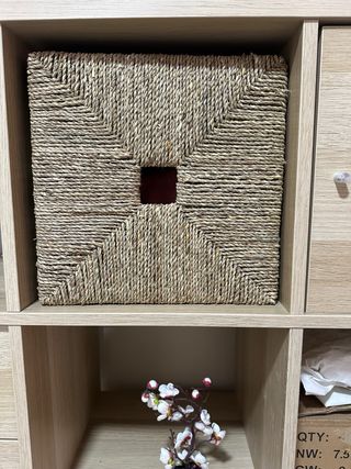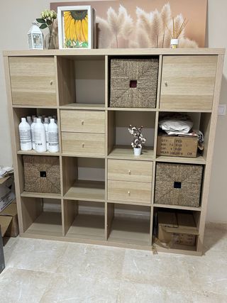 Mueble estantería / aparador modular Mueble de almacenaje en color madera clara, de estilo moderno y funcional. Cuenta con múltiples compartimentos abiertos y cerrados, combinando cajones, puertas y huecos tipo cubo, ideal para organizar y decorar cualquier espacio. Incluye cestas decorativas de fibra natural, perfectas para mantener el orden con un toque cálido. Es muy versátil: sirve como aparador, estantería, mueble auxiliar o para salón, comedor, dormitorio u oficina. ✔️ Gran capacidad de almacenaje ✔️ Diseño moderno y neutro ✔️ Estructura robusta y estable ✔️ Fácil de combinar con distintos estil