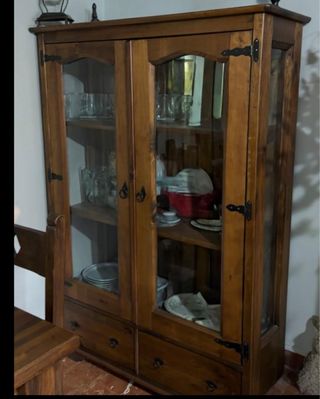Mueble de estilo rústico con puertas de cristal y cajones. - Fabricado en madera. - Puertas con detalles de cristal. - Dos cajones inferiores. Esta es una vitrina rústica o aparador con vitrina, ideal para un salón o comedor. Está fabricada en madera maciza, lo que le otorga gran durabilidad y un encanto natural. Características clave: Material: Madera maciza de pino (común en este estilo), con un acabado encerado o teñido en tono cálido. Diseño: Estilo rústico o colonial, con líneas sencillas y robustas. Almacenamiento: Parte superior: Dos puertas acristaladas (con cristal transparente, posiblemente tipo paraná).