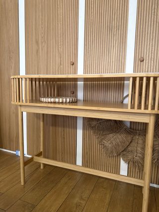 Elegante consola recibidor con un diseño orgánico y natural. - Fabricada en bambú y madera. - Tonos beige y marrón. - Estructura con varillas verticales.