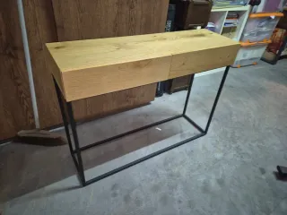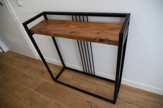 Elegante consola de recibidor a medida. Diseño moderno y funcional. Combina a la perfección la calidez de la madera con la robustez del metal. - Estructura metálica negra. - Encimera de madera con acabado natural. - Patas metálicas en forma de U invertida. - Diseño minimalista y versátil.
