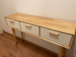 Elegante consola con tres cajones. - Diseño moderno y funcional. - Acabado en madera natural y frentes en blanco.