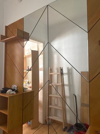 Elegante recibidor con un diseño geométrico que combina madera y espejo. - Paneles de madera con acabado natural. - Espejo central con divisiones. - Compartimentos de almacenaje integrados. - Colgadores de madera.