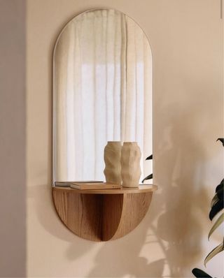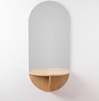 Mueble recibidor espejo y base madera: - Acabado en madera natural. - Forma ovalada con repisa.