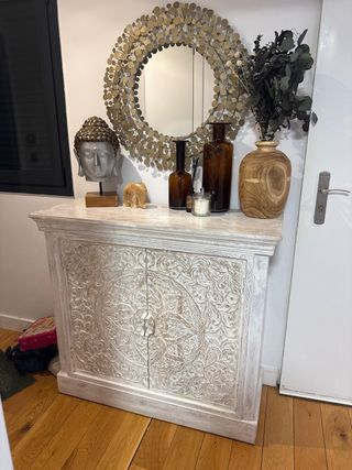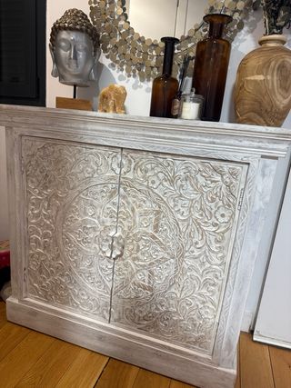 Mueble de entrada con un diseño único y elegante. - Frontales con intrincados tallados. - Acabado en blanco envejecido y detalles en madera natural.