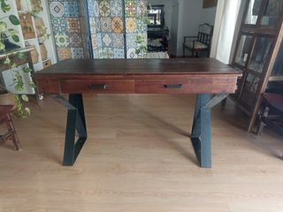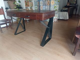 Consola en madera de pino y hierro. Mide 134 x 56 y una altura de 80cms. Estructura de madera de pino en color natural oscurecido apoyado sobre patas de forja de estructura geométrica. Consta de dos cajones de madera natural con tiradores de forja.