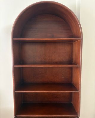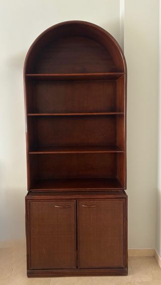 Mueble de madera en tono oscuro, de estilo clásico–vintage, compuesto por dos piezas independientes: Parte superior tipo estantería con arco, ideal para libros, decoración o vajilla. Parte inferior tipo aparador con puertas de rejilla natural, muy decorativas y funcionales. La parte superior es extraíble, por lo que puede usarse: Como mueble completo o como dos muebles independientes. 62,5 cm de ancho parte de arriba 1,4 cm de alto parte de arriba Fondo 32 cm parte de arriba 60cm ancho parte de abajo 66,5 cm de largo parte de abajo 42 cm de fondo mueble de abajo Imagen prototipo de como queda independiente el uno del otro
