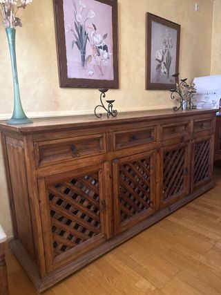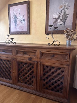 Mueble aparador de estilo rústico, ideal para salón o comedor. Su diseño combina la calidez de la madera con detalles metálicos. - Acabado en tono madera natural. - Puertas con celosía. - Cajones con tiradores decorativos.