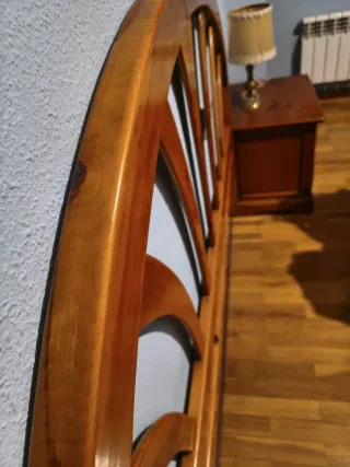 Cabecero de cama con un diseño curvo y elegante. - Válido para camas de 135 a 150. - Fabricado en madera maciza. - Acabado en tono marrón cerezo. - Estructura robusta y duradera. Dispongo también de mesilla de noche y sinfonier con espejo, todo el dormitorio a conjunto. Oferta por venta conjunta (Ver en perfil) # Cómoda, aparador, tocador, mesita.
