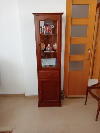 Mueble vitrina con un diseño elegante y funcional. Medidas 136 cm ancho x 148 alto x 40 cm fondo - Estructura principal de madera de cerezo - Puertas superiores con cristal. - Compartimentos de almacenamiento con balda interior de cristal en las puertas superiores - Cajones integrados. PRECIO NEGOCIABLE. ACEPTO OFERTAS