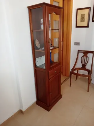Vitrina de madera con puertas de cristal. Se encuentra en buen estado de conservación. Diseño elegante. Amplio espacio de almacenamiento, perfecta para cualquier ambiente. Está montada,se retira en Roquetas de Mar. Mirad las dos últimas fotos que se ve un desperfecto que tiene en un lateral. Precio negociable