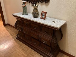 Elegante mueble de entrada con un diseño único. Vendo precioso conjunto de mueble aparador y espejo de gran formato. Es una pieza única con un estilo clásico y detalles ornamentales que la hacen perfecta para dar personalidad a un recibidor, salón o dormitorio. - Acabado en madera con detalles dorados. - Encimera de mármol veteado. Medidas Detalladas: Aparador: Aproximadamente 110 - 120 cm de ancho x 40 cm de fondo x 85 cm de alto. Cuenta con cajones superiores y puertas inferiores con gran capacidad de almacenaje. Espejo: Unos 100 cm de ancho x 80 cm de alto (incluyendo el elegante marco plateado). Características: Diseño: Acab