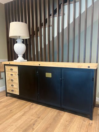 Aparador de estilo industrial con una combinación de madera y metal. - Encimera de madera clara. - Frontal con cajones de madera y puertas negras. - Detalle de placa metálica. - Patas metálicas negras.