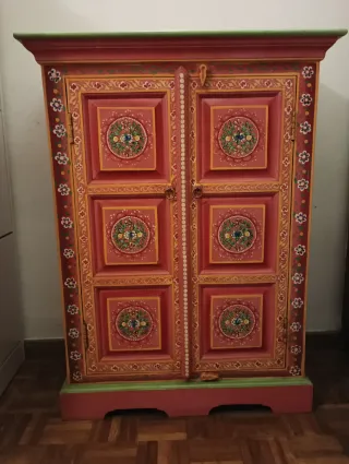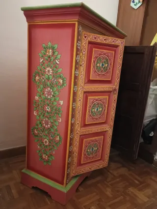 Armario de madera con un diseño pintado a mano muy llamativo. Sus puertas presentan motivos florales y geométricos en tonos vibrantes. - Puertas con paneles decorados. - Tiradores metálicos. - Base y remate superior en verde. *Fondo balda: 23cm.