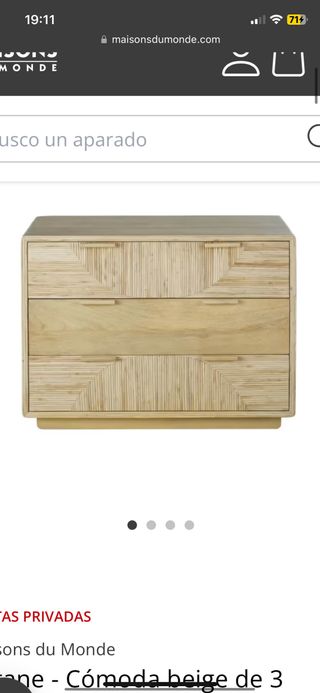 Cómoda/cajonera de Maison du Monde con 3 cajones de marquetería de mimbre beige RATANE. Totalmente nueva. Se vende por problemas de retorno.