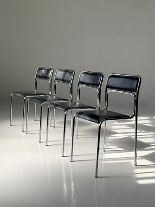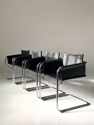 Silla bauhaus en cuero sintético y estructura tubular cromada editada durante la década de 1970. Excelente estado de conservación, apenas leves signos de uso. Más imágenes por WhatsApp. Precio por Silla 120. Cuatro disponibles Entrega gratuita en Barcelona. Consultar resto península. silla vintage, mid century, cantilever, voladizo, cesca, breuer, stam, lc1, lc2, eames, lounge, mesa vintage, butaca vintage, Bauhaus, silla diseño, cromado, estantería taburete, aparador, silla diseño, sillon,enetri, mobles 114 pilma mesa centro bufet, cantilever, Wassily, tubular, modular, kartell, Multistrux, stua, gascon, tria, mobles 114, pilma