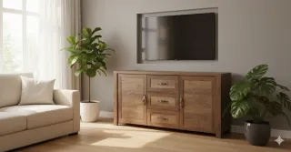 Mueble de estilo rústico, perfecto para dar un toque acogedor a tu hogar. Su diseño combina funcionalidad y estética. - Fabricado en madera maciza. - Acabado en tono natural. - Amplio espacio de almacenamiento con cajones y puertas.