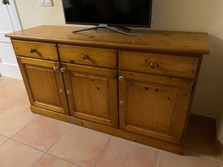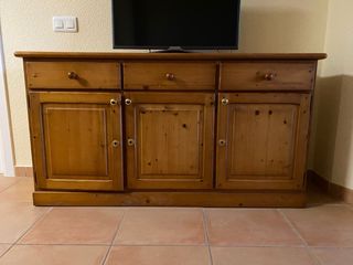 Mueble aparador de madera de pino con acabado rustico. Cuenta con tres cajones superiores y tres puertas inferiores. Medidas totales 166x45x89cm. Está en buen estado, en la trasera tiene un arreglo echo con madera ya que se estropeó un poco en la trasera (puede observarse en las fotos). Recoger en Córdoba capital