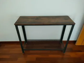Mueble recibidor de diseño industrial con tablero de madera rústica y estructura de metal negro. ➡️ Ideal para entradas estrechas, pasillos o detrás del sofá. Muy estable y en perfecto estado. 📏 Medidas: 115 x 30 x 80 cm (Largo x Ancho x Alto). ➡️ Extras: Incluye estante inferior de rejilla metálica para zapatos o cajas. ➡️ Estado: Muy bien cuidado, como nuevo. 📍 Disponibles para ver sin compromiso. 🚚 Envío disponible. 📩 Consulta por mensaje privado