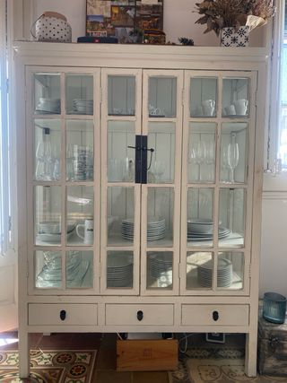 Armario vitrina estilo rústico y vintage. blanca con nogal el cristal tiene una pegatina opaca que se puede quitar y queda transparente es muy solida medidas: 101x36 alto 178cm interior: 52cm 34 y 38cm ✅ 🤔 cualquier duda me puedes preguntar sin compromiso. estoy abierto a ofertas razonables 🚚 si es necesario yo mismo te lo llevo a la entrada de tu edificio. 💰 Cobro en efectivo y Bizum; si vienes tú, también tarjeta 💳. 📦 Hago envíos.🏠 entrego en passeig d`urrutia 08042 Barcelona. Cerca metro llucmajor línea 4 amarilla. ronda de dalt salida (3 o 4)📍 Fácil de recoger a nivel de calle.