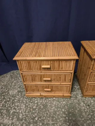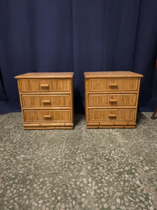 Pareja de mesillas de noche vintage realizadas en caña de bambú Dispone de 3 prácticos cajones, para guardar el cargador, documentos, etc Ideal para un dormitorio a los dos lados de la cama Miden 48'2*32'5cm, 50cm alto espacio útil cajón: 39'6*27'5*10'2cm VDV3299 becara Borgia Conti maison du monde jansen hanbel Valentí antigua antiguo antigüedad imperio olot zara kave home aplique Luis XV XVI mármol napoleon III isabelino victoriano sklum cómoda espejo veneciano cornucopia aparador bambú sol retro cesca vitra space age Manises Bondia porcelana mesita auxiliar sofá auxiliares restaurar industrial Corbusier sputnik aparador reloj