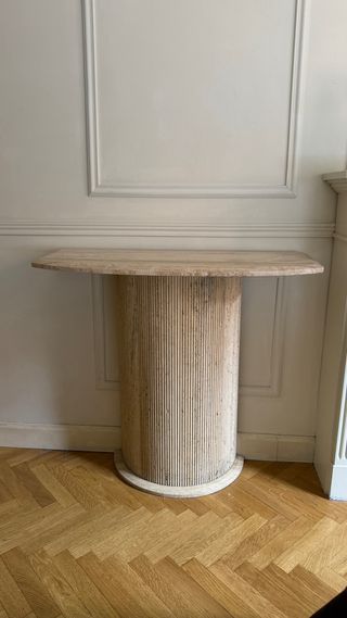 Consola vintage en travertino con base cilíndrica acanalada. - Encimera de mármol travertino. - Base cilíndrica con estrías verticales. - Acabado natural del material. Sólo recogida en Madrid.