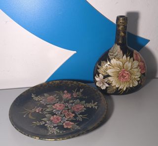 Precioso conjunto decorativo de cerámica pintados a manos, el lote incluye un plato y jarrón a juego. Fondo color negro con flores color rosa, azul y blanco , Estilo: Vintage / Romántico / Barroco. Ideal como centro de mesa, para decorar aparadores o vitrinas. En muy buenas condiciones. Se puede enviar o recoger en Tienda solidaria piel de Mariposa MÁLAGA C/Héroe Sostoa 80 (+ info en la última foto)