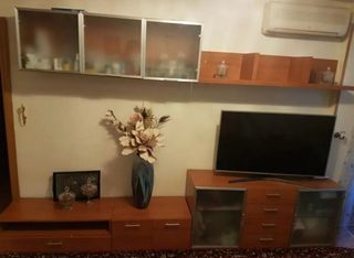 Mueble de salón de madera maciza color cerezo en muy buen estado. Formado por: - Estantería abierta con varios niveles. - Vitrina con puerta de cristal. - Mueble bajo con puertas abatibles para almacenaje. Urge vender.