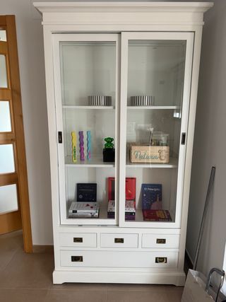 Bonito aparador de madera y cristal, color blanco. Tiene dos puertas con cristales, varios estantes y un cajón. Está en buen estado, aunque se ve algo desordenado en la foto. Ideal para organizar libros, juegos y objetos decorativos. - Dos puertas con cristales - Varios estantes - Un cajón