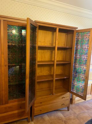 Armario vitrina con puertas de cristal y detalles de madera. - Diseño con cristales de colores y formas geométricas. - Dos cajones inferiores con tiradores metálicos.