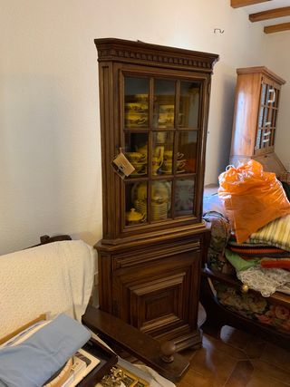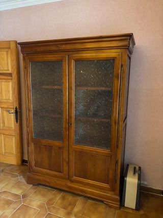 vitrina de madera maciza con puertas de cristal y dos cajones. Perfecto estado salvo por una pequeña quemadura en la parte superior