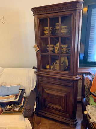 Elegante vitrina esquinera de madera con detalles de cristal. - Medidas: 1.93 metros de alto por 70 cm de ancho. - Diseño de esquina que optimiza el espacio. - Puerta acristalada con divisiones decorativas.