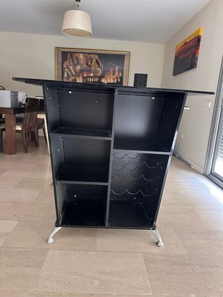 Estaba guardado sin usar, no ha estado en la cocina( por lo que no tiene grasa) es de forja con mimbre y espacio para 5 botellas.