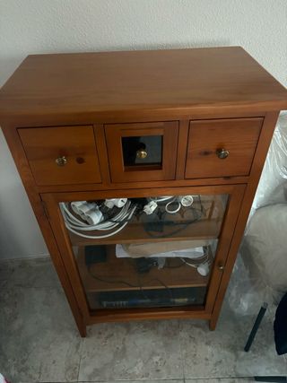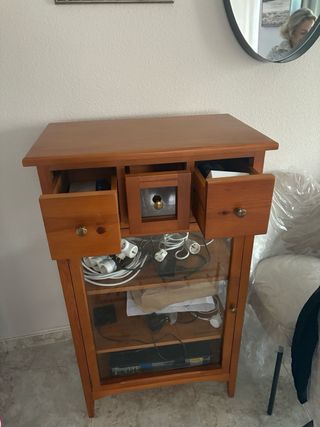Vendo vitrina de madera maciza muy bien cuidada, sin ningún desperfecto. Está en perfecto estado, ideal para salón o comedor. Cuenta con varios compartimentos: • Parte superior con vitrinas y puertas de madera • Zona central perfecta para colocar televisor u objetos decorativos • Parte inferior con cajones y armarios amplios para almacenaje Mueble muy resistente y de gran calidad, con un acabado clásico que combina con todo tipo de decoración.