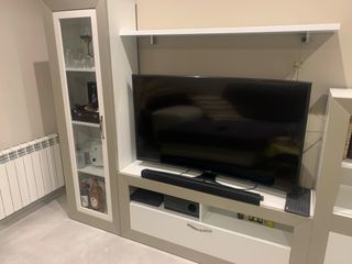 Mueble de salón completo nuevo, compuesto de mueble TV + vitrina + aparador color beige y blanco. Largo 2,95metros También en venta la mesa y sillas totalmente nuevas y sin un mal arañazo. Precio del paquete a negociar.