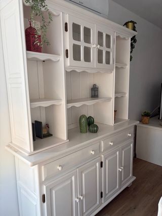 Mueble aparador de estilo antiguo fabricado en madera de pino. Cuenta con una vitrina superior con puerta de cristal y un cajón. - Diseño clásico con detalles ornamentales. - Puertas inferiores con tiradores. - Estantes interiores. Recogida en persona.