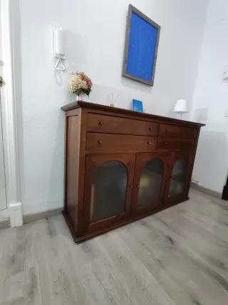 Aparador de madera de teka maciza y bambú importado de Indonesia. Cuenta con un diseño clásico y elegante, ideal para cualquier comedor o sala de estar. - Elaborado en madera de alta calidad. - Acabado en tono oscuro. - Múltiples cajones y puertas para almacenamiento. El precio no es negociable, está valorado en >900€