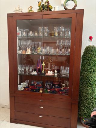 Precioso mueble aparador de madera, ideal para salón o comedor. Se encuentra en buen estado, con algunos signos normales de uso. - Diseño clásico y elegante. - Gran capacidad de almacenaje. - Perfecto para organizar y exhibir objetos decorativos. - Consta de vitrinas con puertas de cristal, estantes, cajones y puertas con espacioso almacenaje.
