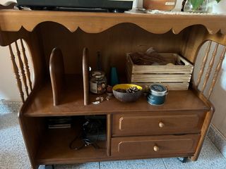 Aparador con ruedas de estilo antiguo. Con 2 cajones. Funcional. Se puede colocar arriba una tv pequeña o utilizarla para el guardado de cosas . Se puede usar así tal cual o en caso de desear pintarlo / restaurarlo quedaría muy bien por el estilo vintage que tiene .