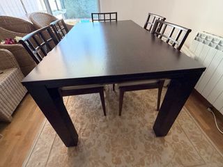 Conjunto de comedor con mesa y seis sillas en buen estado. - Mesa de comedor oscura. - Seis sillas a juego con respaldo de celosía. - Aparador incluido.