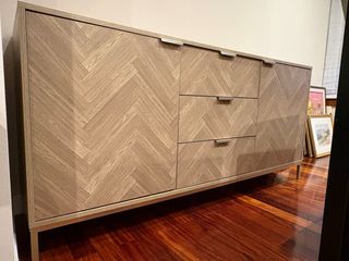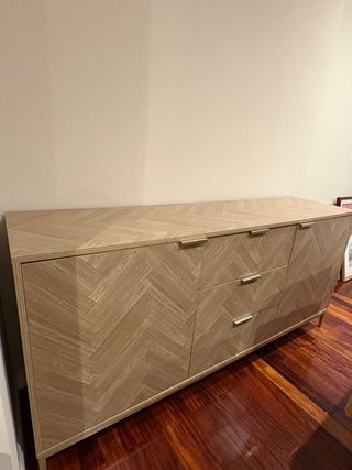 Elegante aparador con un diseño de espiga en la madera. Sus tiradores patas metálicas doradas le dan un toque moderno. Solo para recoger.