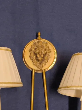 Aplique clásico en bronce dorado con embellecedor con cabeza de león. Ideal para un hall, dormitorio, salón etc Dispone de 2 puntos de luz por aplique, con los embellecedores con forma de vela derretida. Instalación eléctrica en buen estado 38cm alto, 37cm ancho y 19cm de vuelo (lo que sobresale de la pared). Tulipas de regalo VDV1714 imperio lámpara midcentury Hollywood regency diseño italiano Borgia Conti becara bambú hanbel vintage antiguo antigüedad antigua retro zara kave home pareja araña atrezo Valentí Ikea Luis XV XVI space age urna Napoleón III maceta pared columna plata isabelino isabelino victoriano rejilla pantalla
